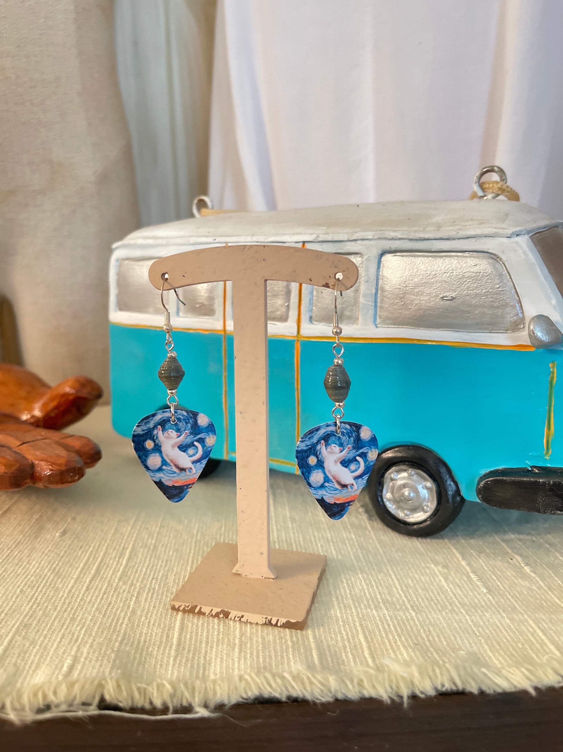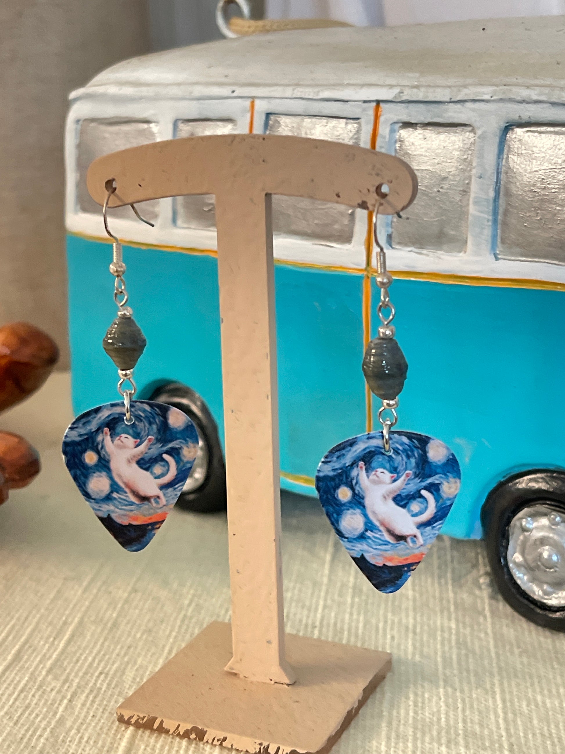 Luce un estilo único y consciente con estos aretes artesanales hechos a mano. Cada pieza combina cuentas de papel reciclado y pajuela de gato con fondo Van Gogh, emulando la belleza del arte.