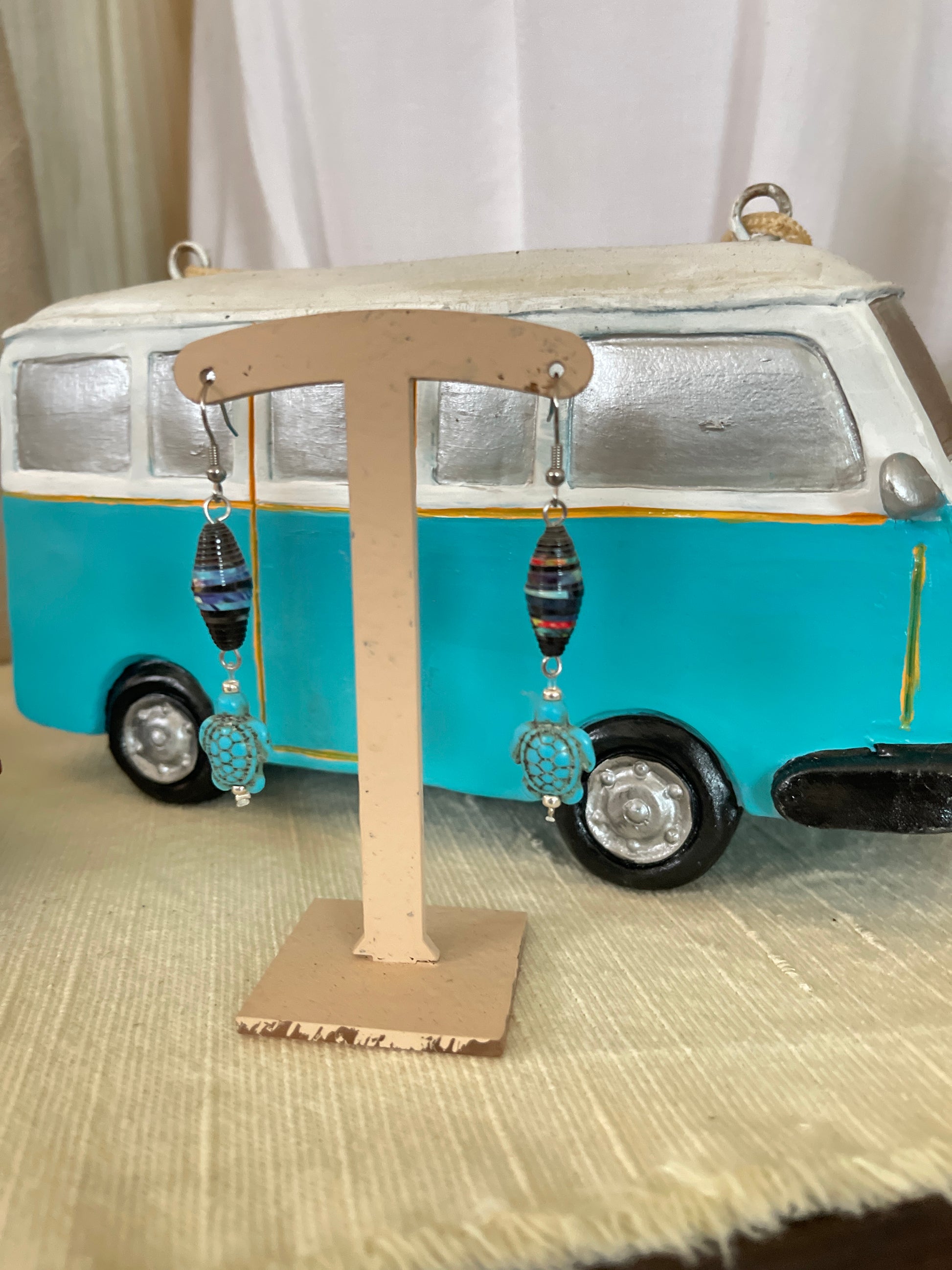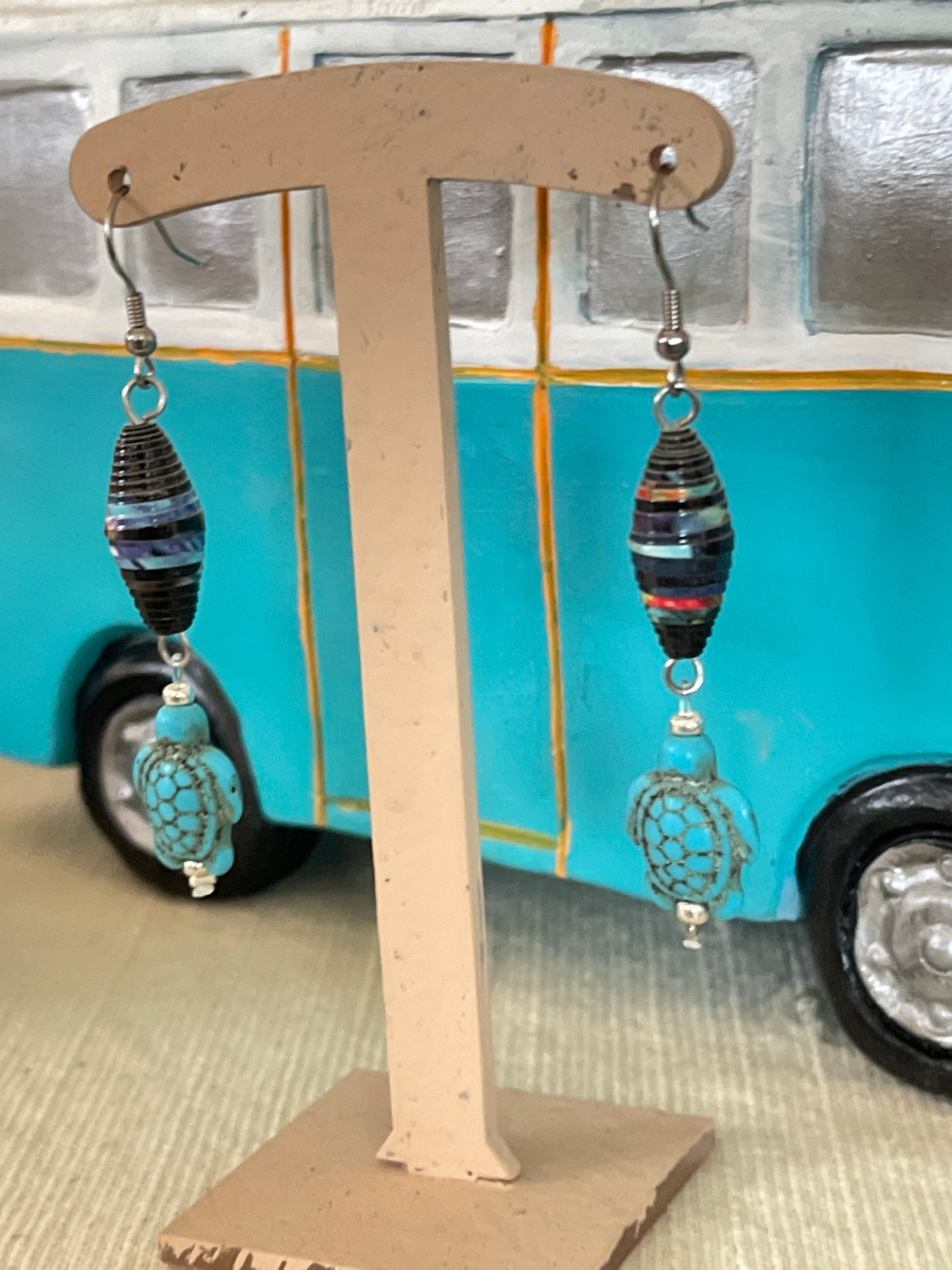 Luce un estilo único y consciente con estos aretes artesanales hechos a mano. Cada pieza combina cuentas de papel reciclado con colgantes de tortuga color turquesa