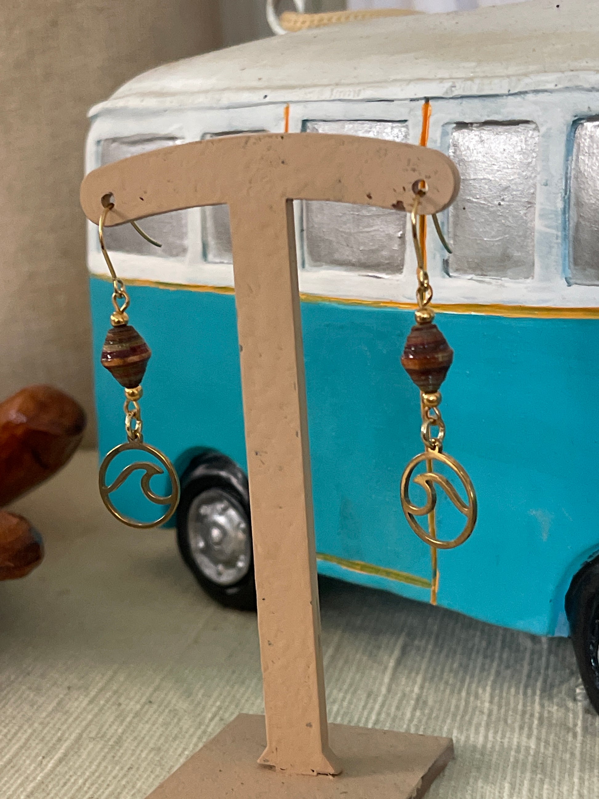 Luce un estilo único y consciente con estos aretes artesanales hechos a mano. Cada pieza combina cuentas de papel reciclado en tonos tierra con un colgante en acero inoxidable en forma de ola, símbolo de fuerza, fluidez y conexión con el mar.
